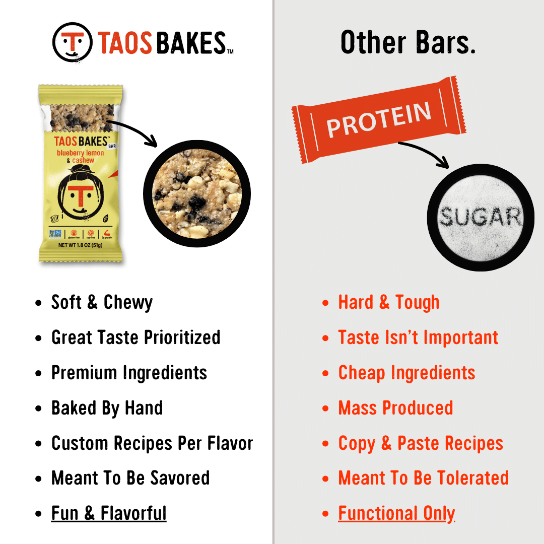That’s where Taos Bakes comes in. We’re obsessed with great taste, the kind that you can see, smell, and feel. Our snacks (not to be confused with those lumpy cardboard-tasting bars you may have run into) live at the intersection of people, process, and food.