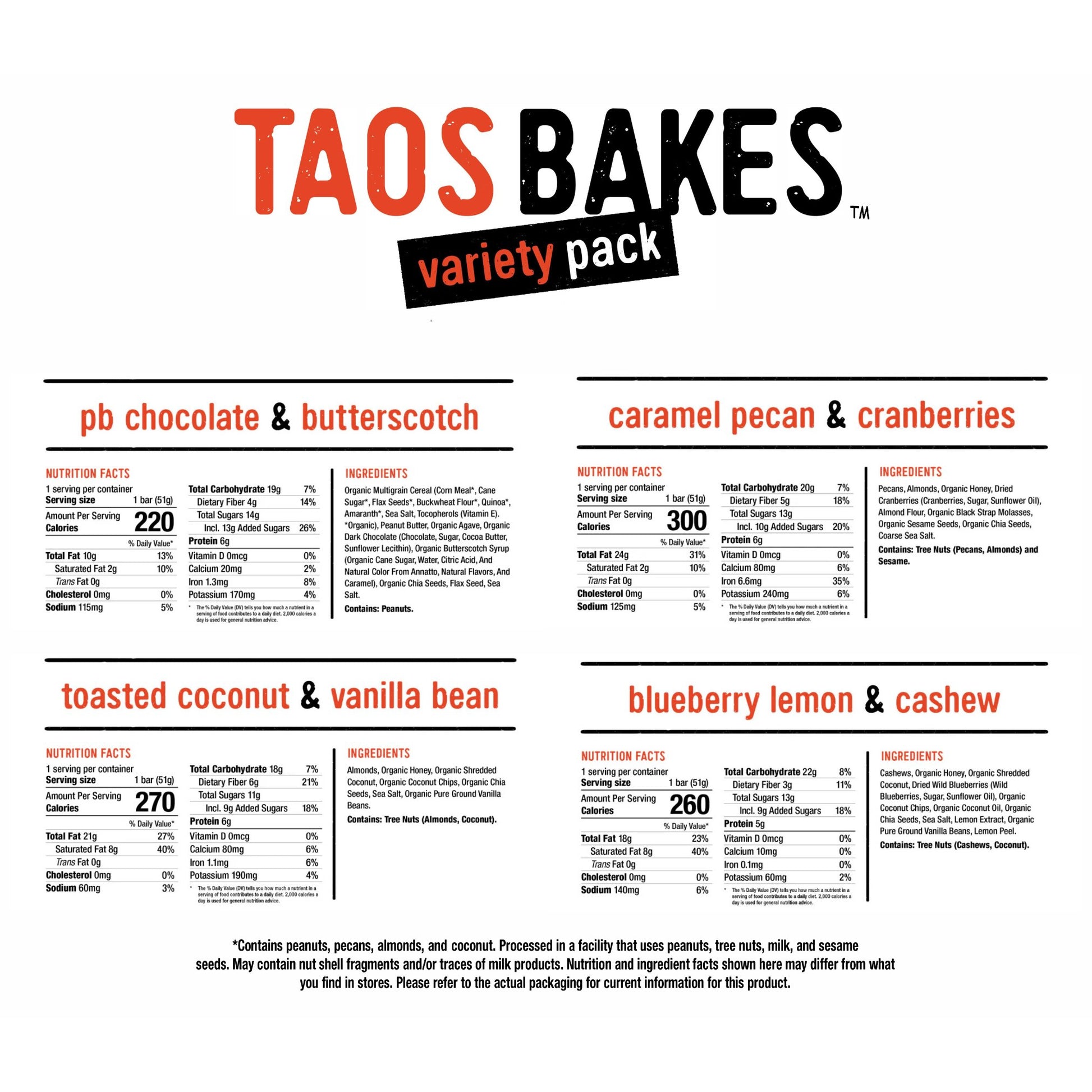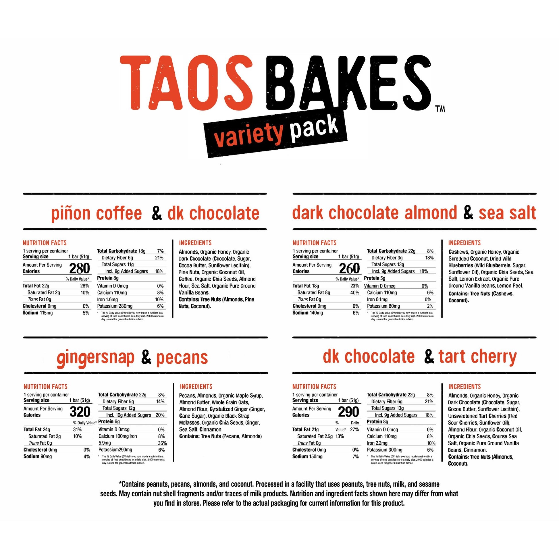 Taos Bakes Bars*None of our Bakes or Bites contain dairy but the following products are baked using chocolate sourced from a facility that also makes products containing milk. - Dark Chocolate Almond + Sea Salt