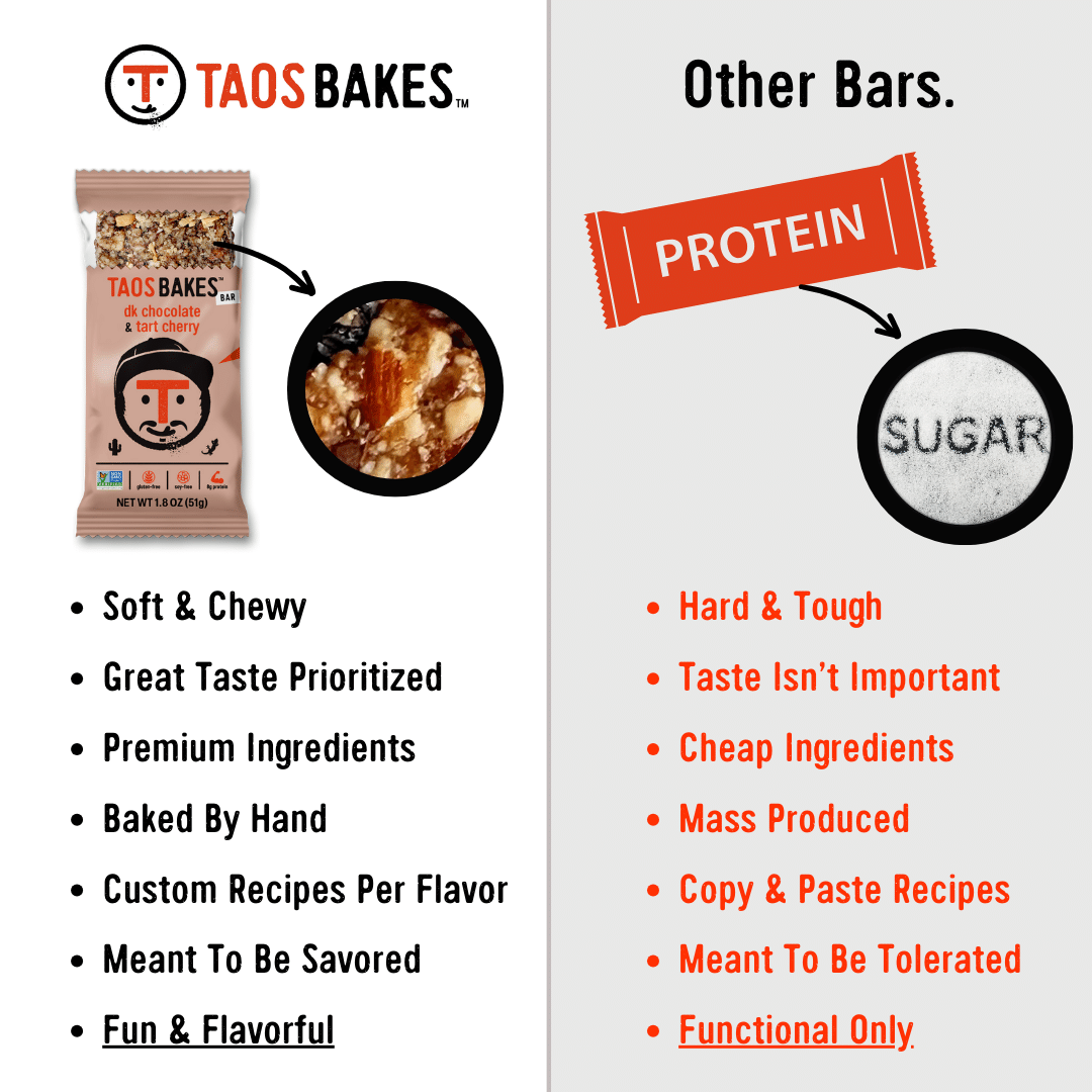 That’s where Taos Bakes comes in. We’re obsessed with great taste, the kind that you can see, smell, and feel. Our snacks (not to be confused with those lumpy cardboard-tasting bars you may have run into) live at the intersection of people, process, and food.